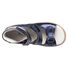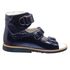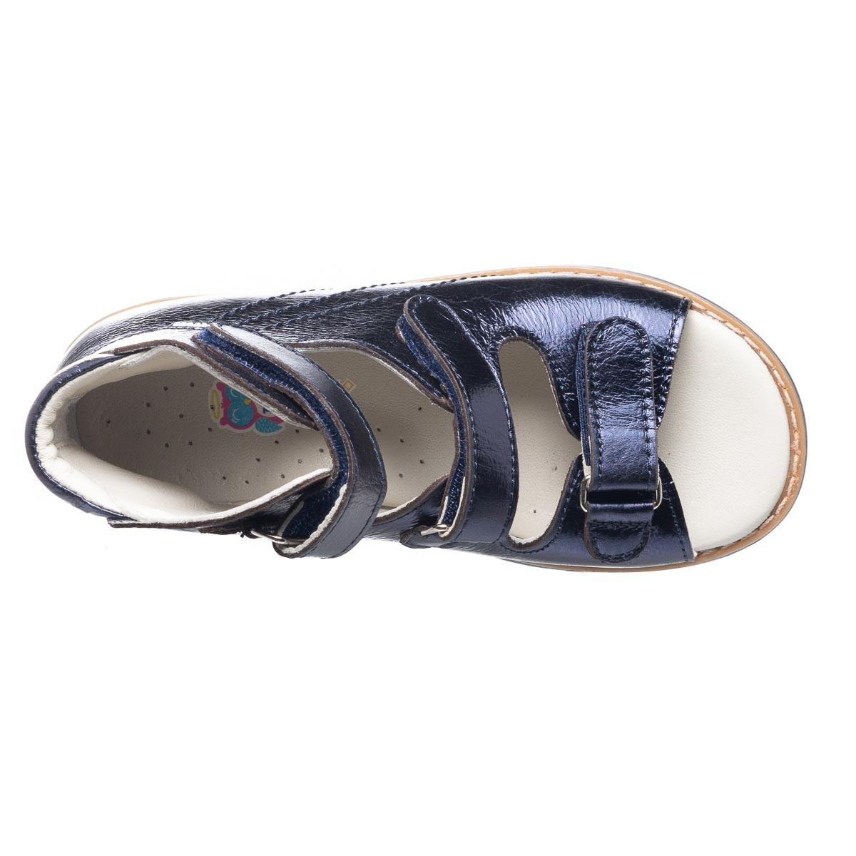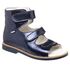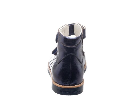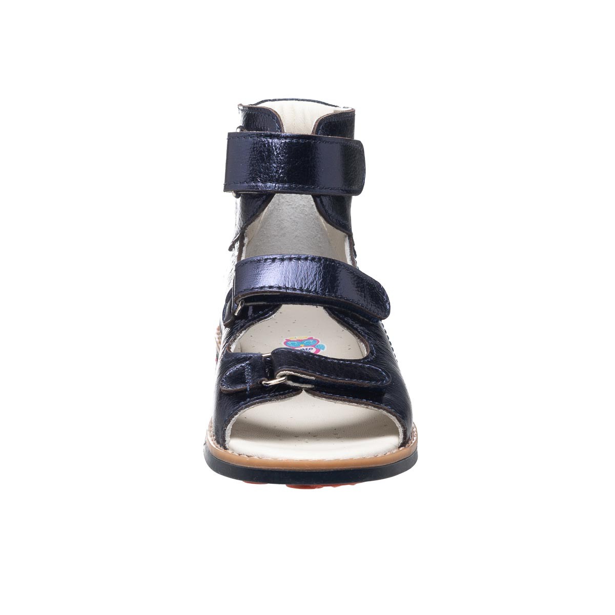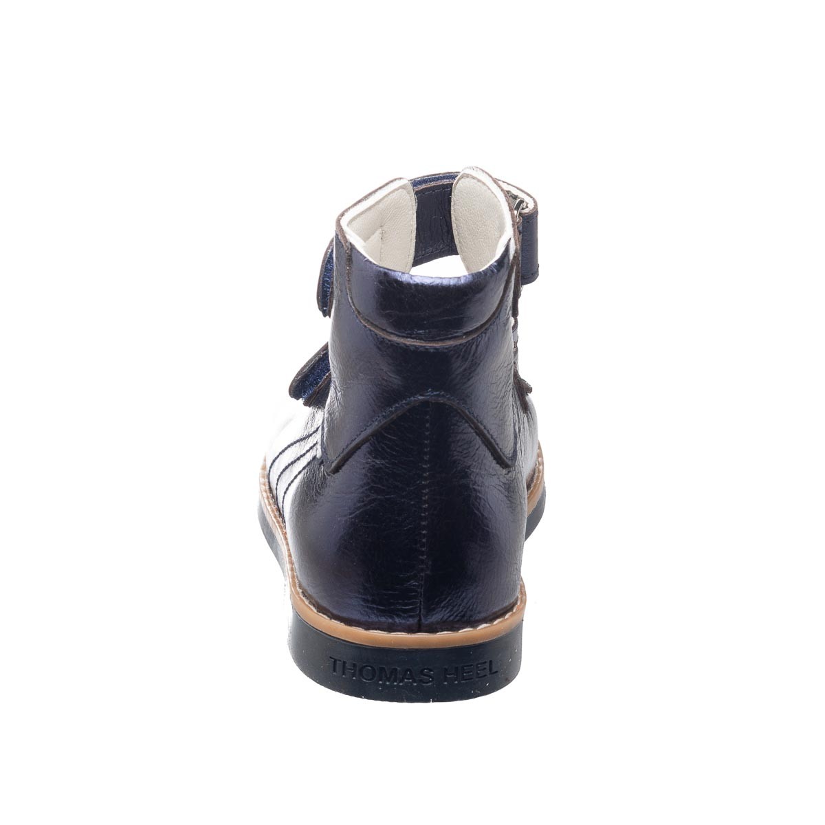 THEO LEO 951 - ортопедичні сандалі з високим задником виконані з натуральної шкіри темно синього кольору з перламутровим відливом. Устілка з анатомічним супінатором і підкладка - натуральна шкіра. Одягаються та іксуються за допомогою трьох липучок. Підошва з термопластичної гуми з каблуком Томаса - не ковзає і добре амортизує. Завдяки підборах Томаса дитяча стопа не буде завалюватися всередину.