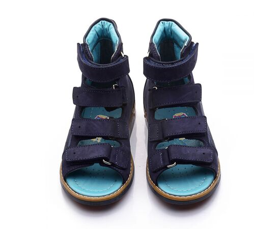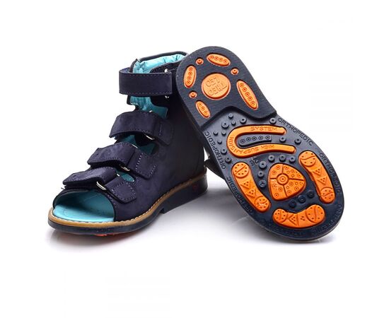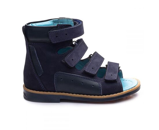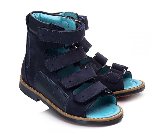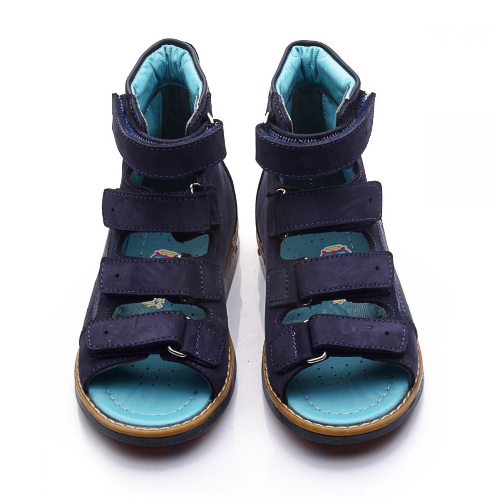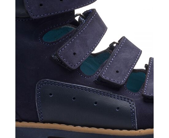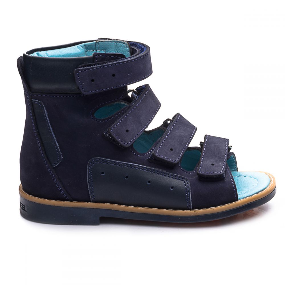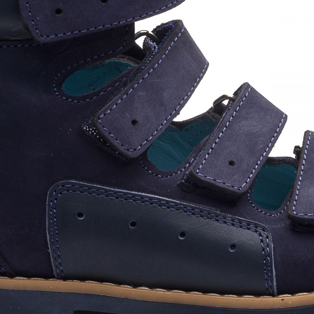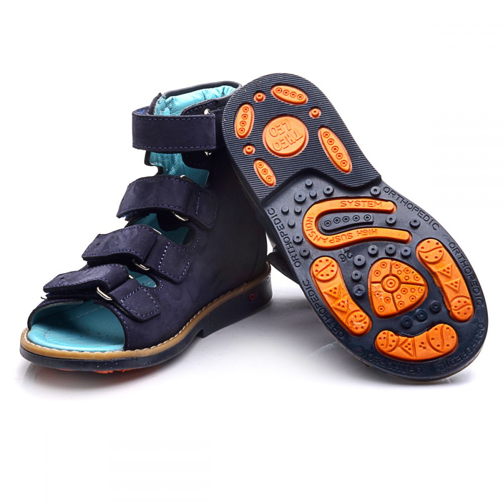 THEO LEO 719 - ортопедичні босоніжки для хлопчика виконані з натурального нубуку темно-синього кольору з шкіряними вставками в тон. Підкладка та устілка - натуральна шкіра блакитного кольору. Верх босоніжка м'який, щоб не натирати ніжну дитячу шкіру. Дотримані всі необхідні вимоги до ортопедичного взуття: анатомічний супінатор, жорсткий задник, високі берці, чотири липучки, каблук Томаса, підошка, яка не ковзає. Завдяки каблуку Томаса дитяча стопа не буде завалюватися всередину.