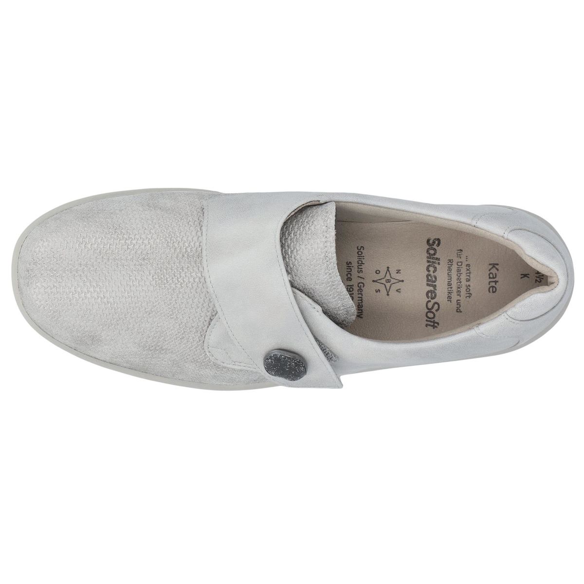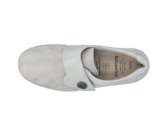 Взуття Kate (шириною K) має застібку-липучку, що забезпечує точну посадку по нозі, та полегшує надягання та зняття взуття. Підкладка з мікрофібри (яку легко прати) без дратівливих швів, елегантна форма взуття в стриманому світло-сірому кольорі на невагомі зручні підошві – все продумано до дрібниць в моделі Kate Solicare Soft, щоб стопи діабетиків оцінили справжнє диво комфорту.