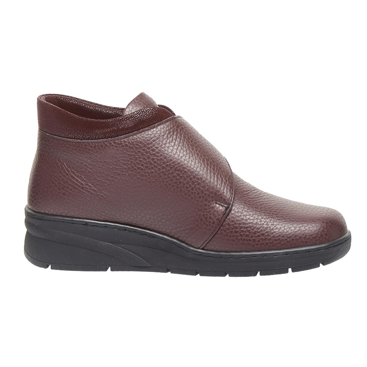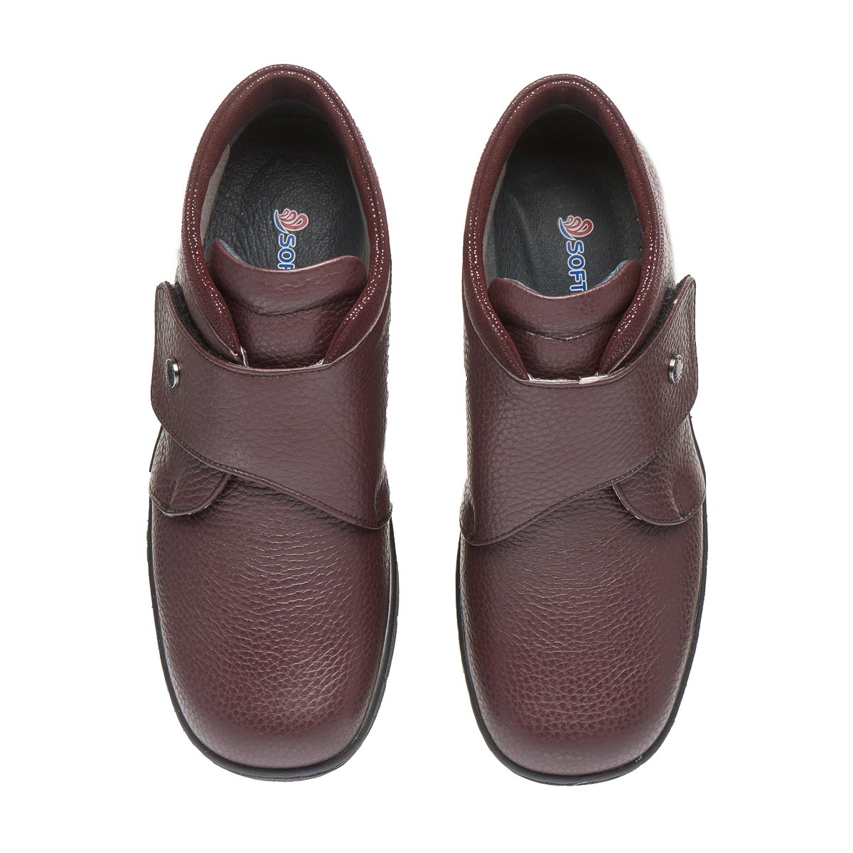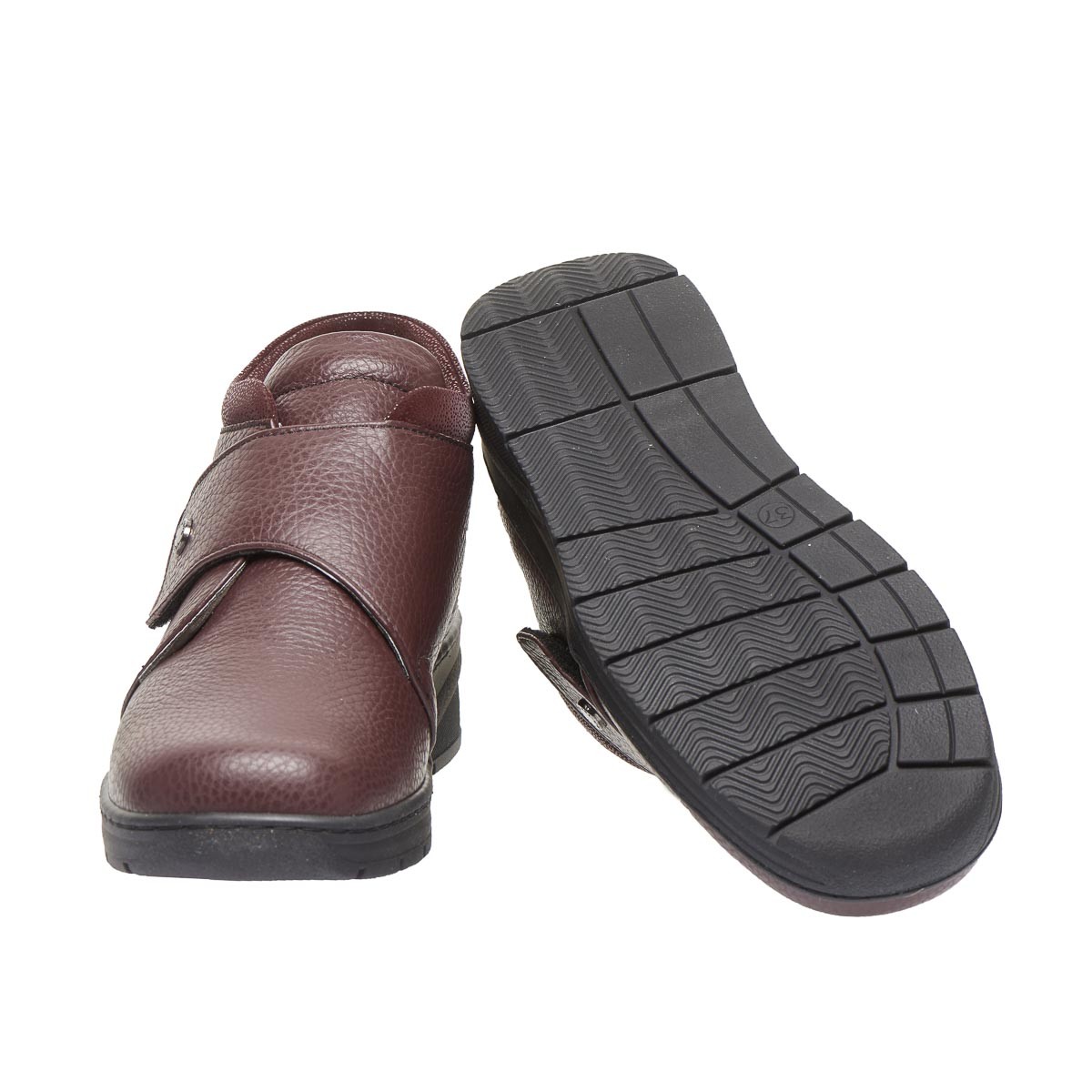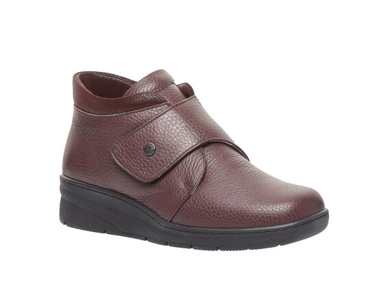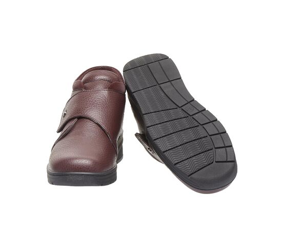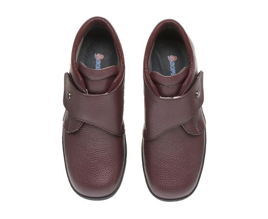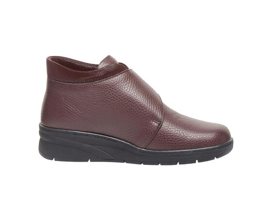 Зручне демісезонне взуття виготовлене з натуральної шкіри, бордового кольору, з лаковою манжетою та застібкою на липучці забезпечує максимальну зручність, допоможе при профілактиці та лікуванні плоскостопості будь якого типу чи вальгусної деформації. Взуття створене для широкої стопи ноги, з використанням інноваційних матеріалів, надлегке, зменшує тиск на суглоб великого пальця стопи, сприяючи комфорту та мобільності.